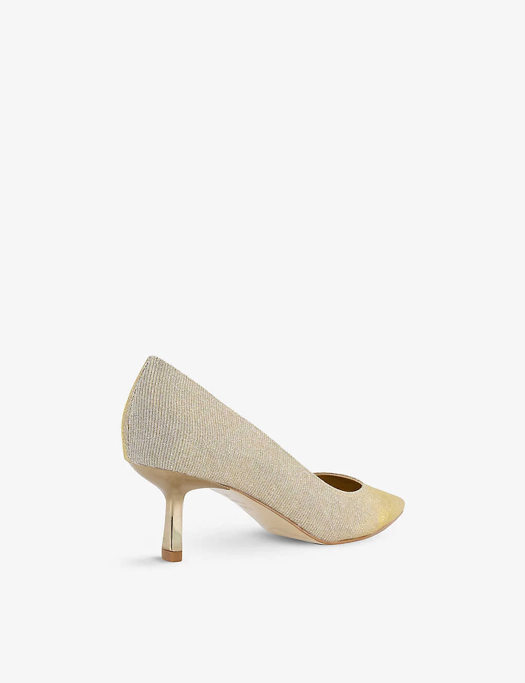 - Pointed toe, metallic finish, slim gold heel