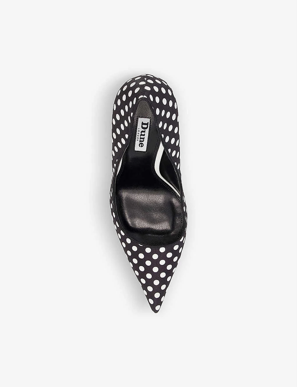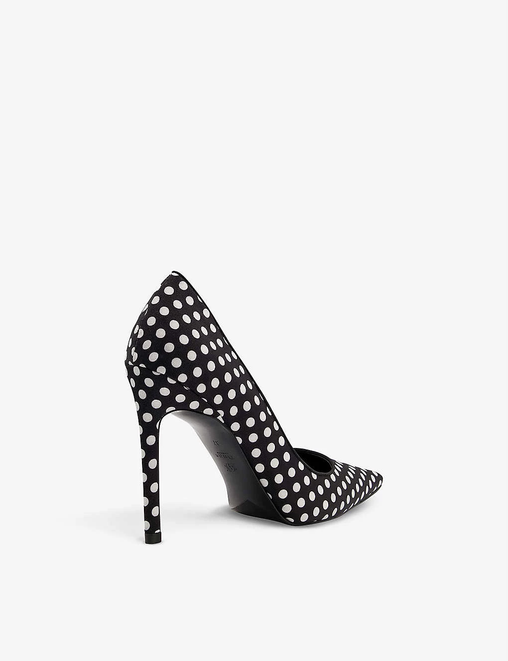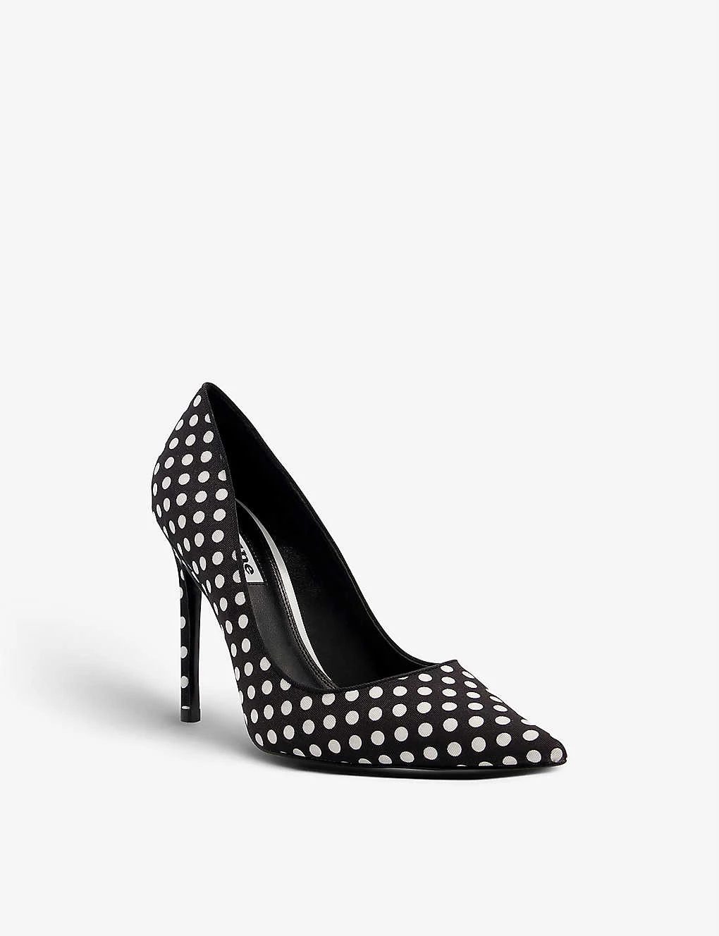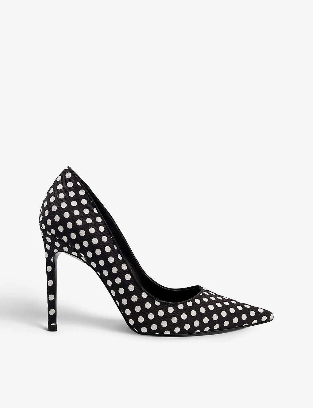 - Polka-dot print, pointed toe, stiletto heel, logo-patch on insole