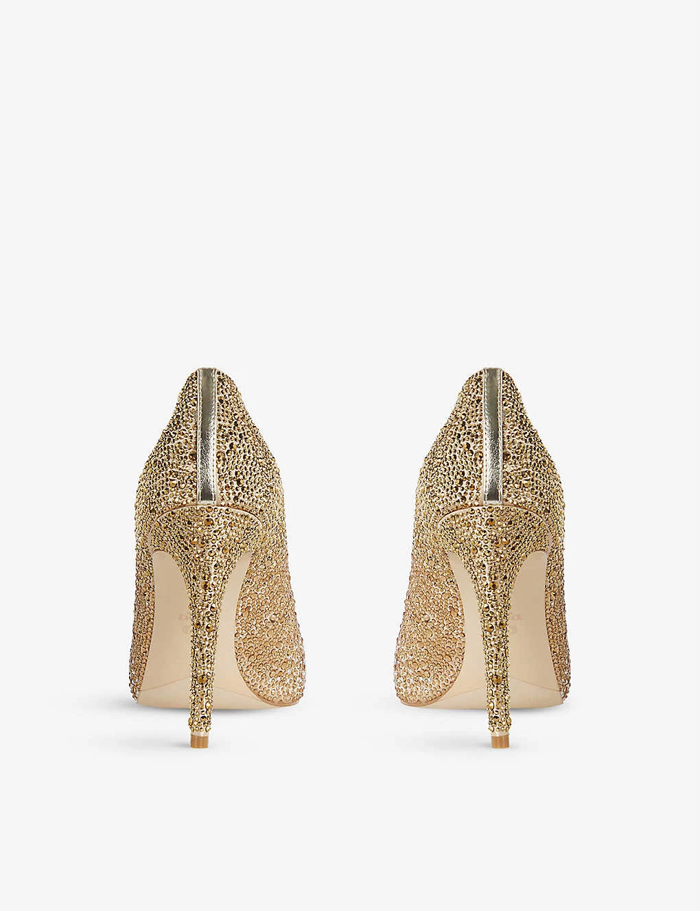 - Pointed toe, all-over gemstone embellishment, stiletto heel