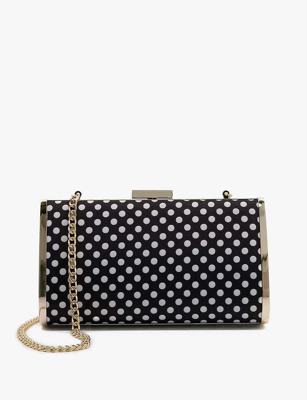- Hard case, rectangular shape, polka dot print, fully lined, gold-tone hardware, chain shoulder strap, top clasp closure