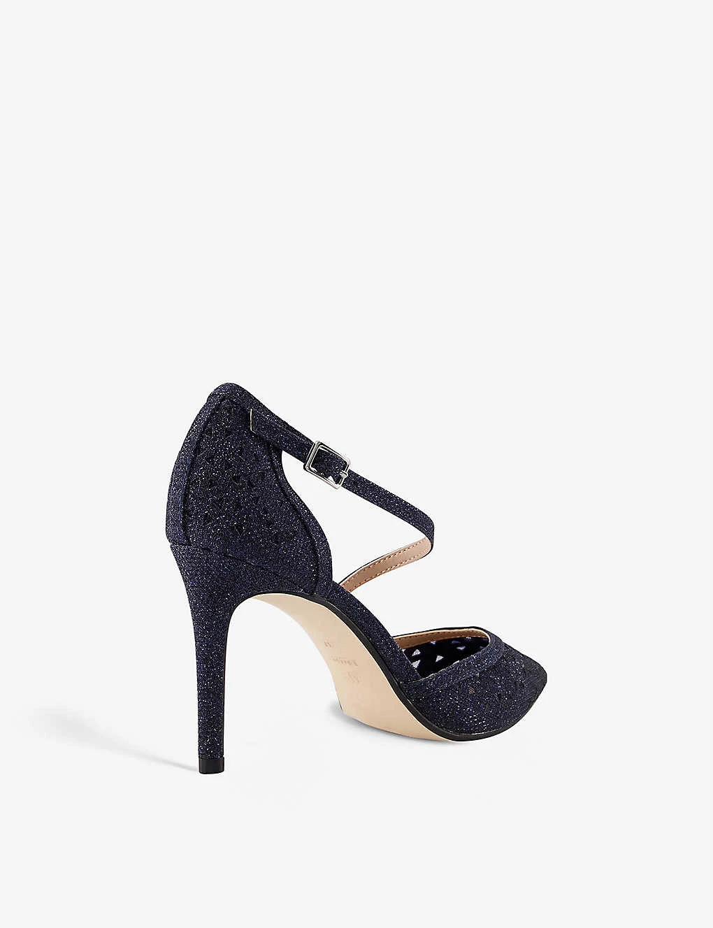 - Pointed toe, asymmetric strap, all-over laser cut geometric details, closed back, stiletto heel