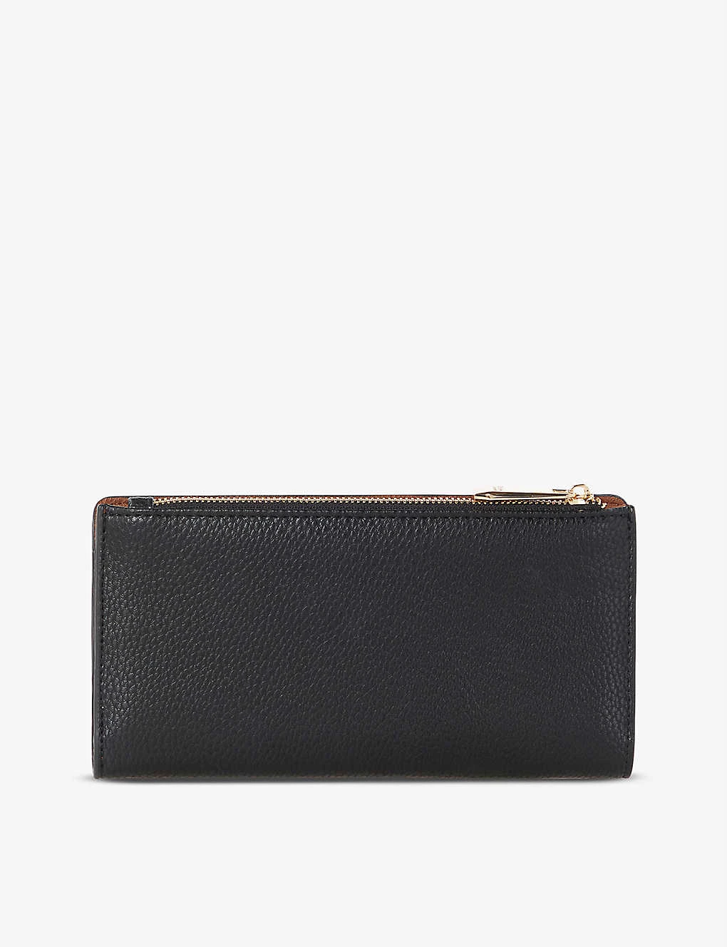 - Slimline silhouette, colour block, gold-tone branding, cards slots, notes compartment, zip pocket