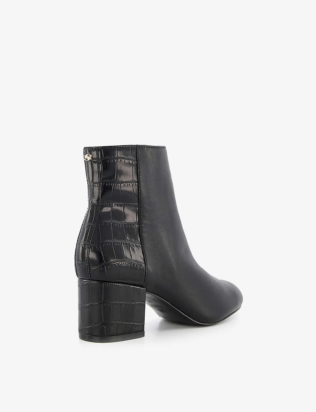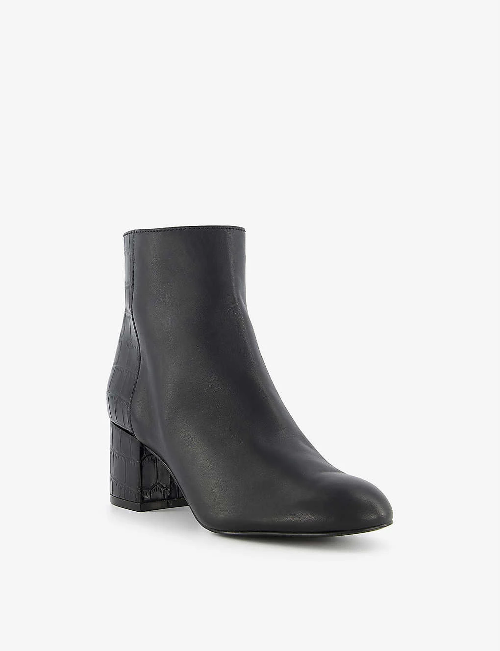 - Round toe, side zip fastening, rear mock-croc panel, medium block heel