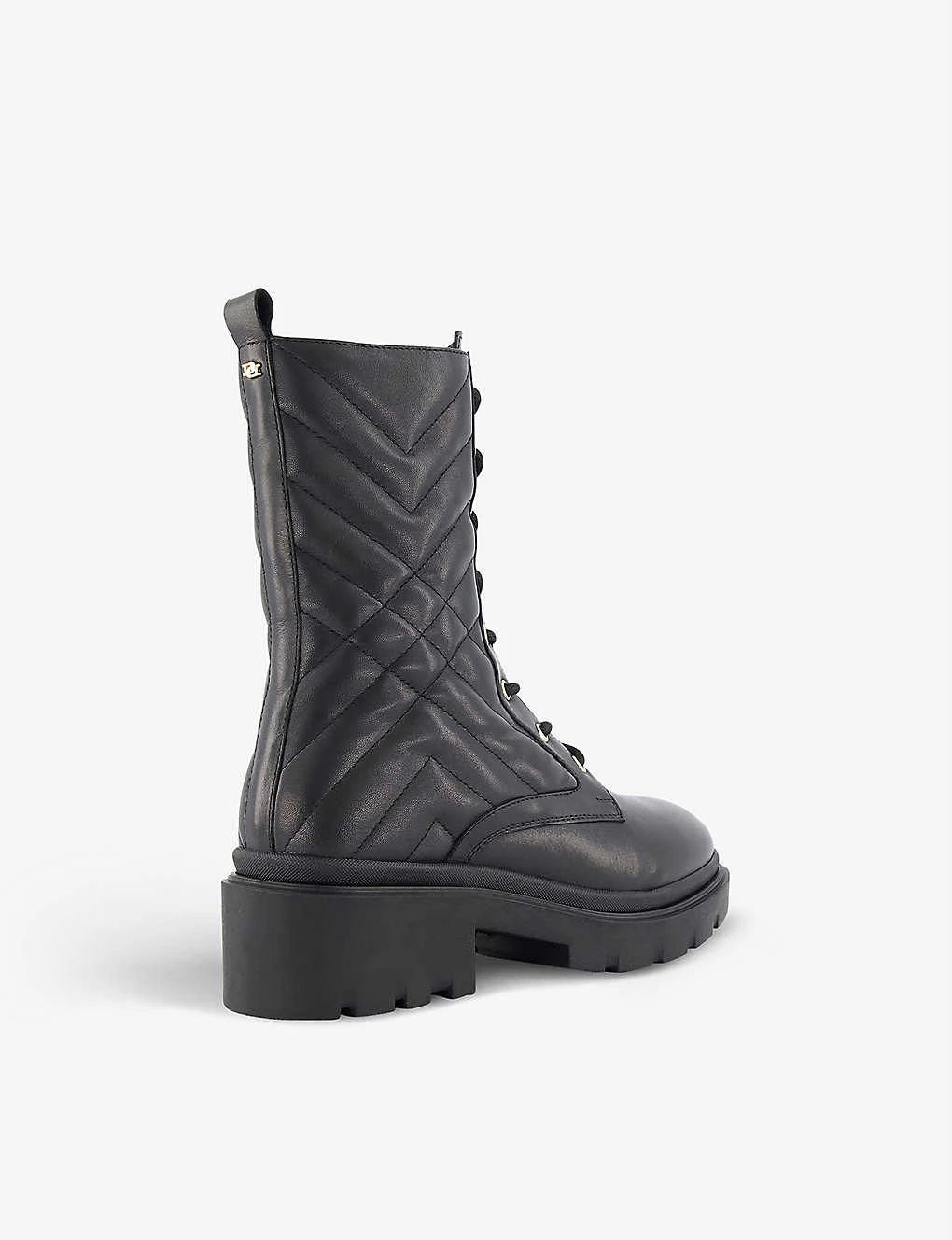 - Round toe, all-over quilted detail, calf-length, chunky cleated sole